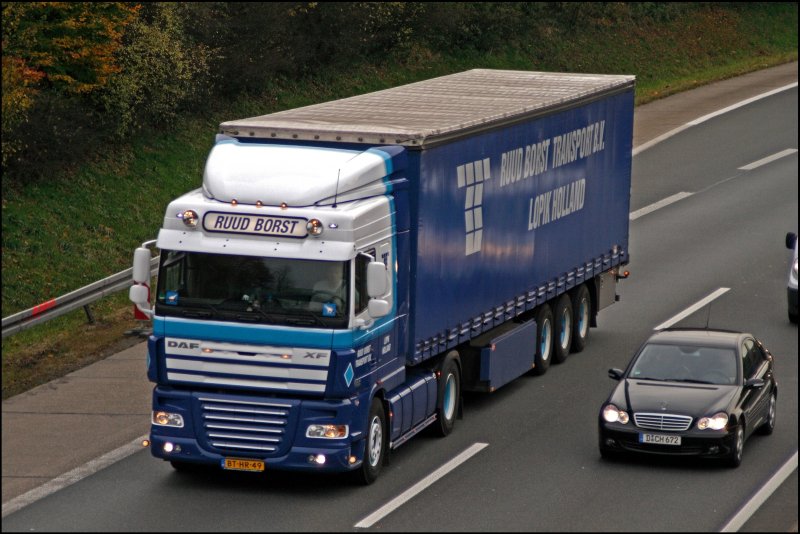 RUUD BROST: Dieser niederländischer DAF XF105.410SC "SpaceCab" hat auch ein bisschen "Zusatzbeleuchtung" und ist in Richtung Ruhrgebiet unterwegs. (28.10.2008)