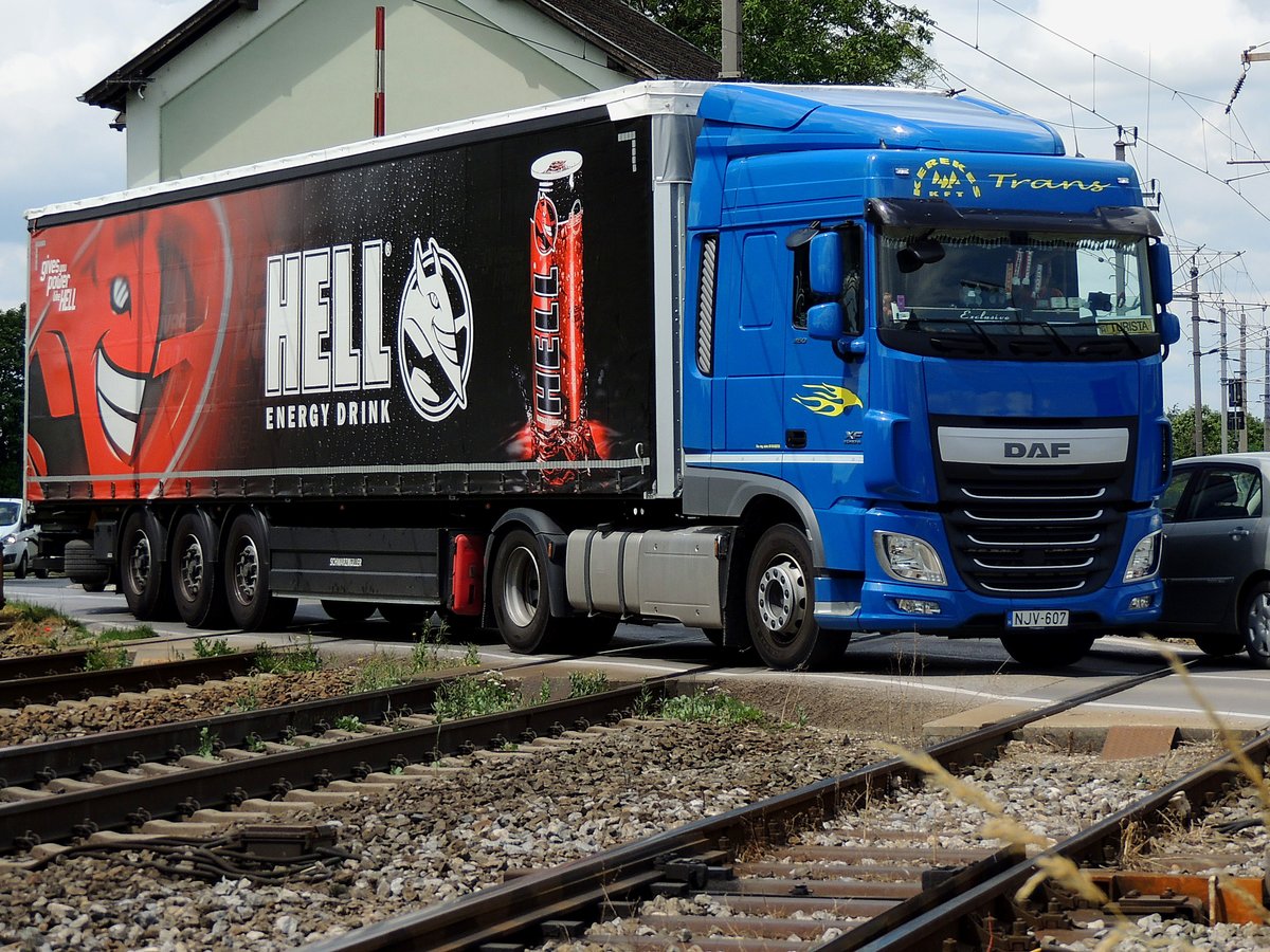 DAF XF euro6, quert einen Bahnübergang entlang der Ostbahn; 160614