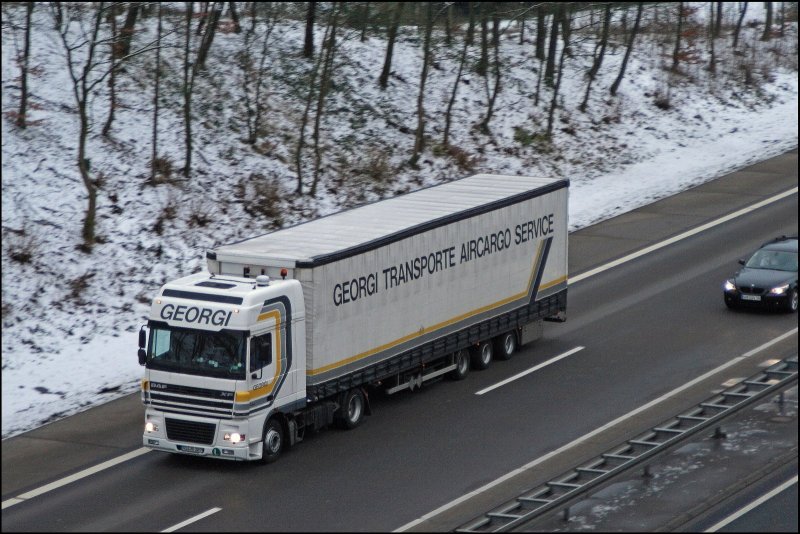 MITZIEHER Nr.2: Ein DAF XF95.430 von GEORGI TRANSPORTE AIRCARGO SERVICE hat vermutlich Luftfracht geladen oder ist in Richtung Dortmunder Flughafen unterwegs. (11.12.2008)