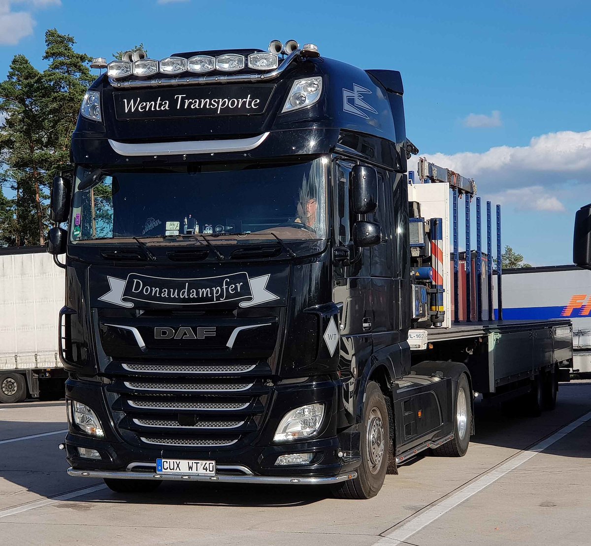 =Der DAF "DONAUDAMPFER" von WENTA-Transporte rastet an der A 7 im August 2020. Viele Grüße an den netten Fahrer!
