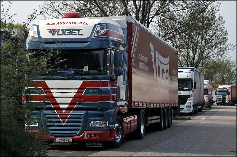 Wirtschaftskriese sind bei solchen Bildern irgentwie schwer vorzustellen... Fahrer Andreas hat seinen DAF XF105.460SCC "SuperSpaceCab" in den Pkw-Parkbuchten abgestellt und wartet wie sein Kollege auf die Weiterfahrt. Man beachte das Namenschild an der Frontscheibe und den Namenschriftzug an der Seite des "Cäbchens".
