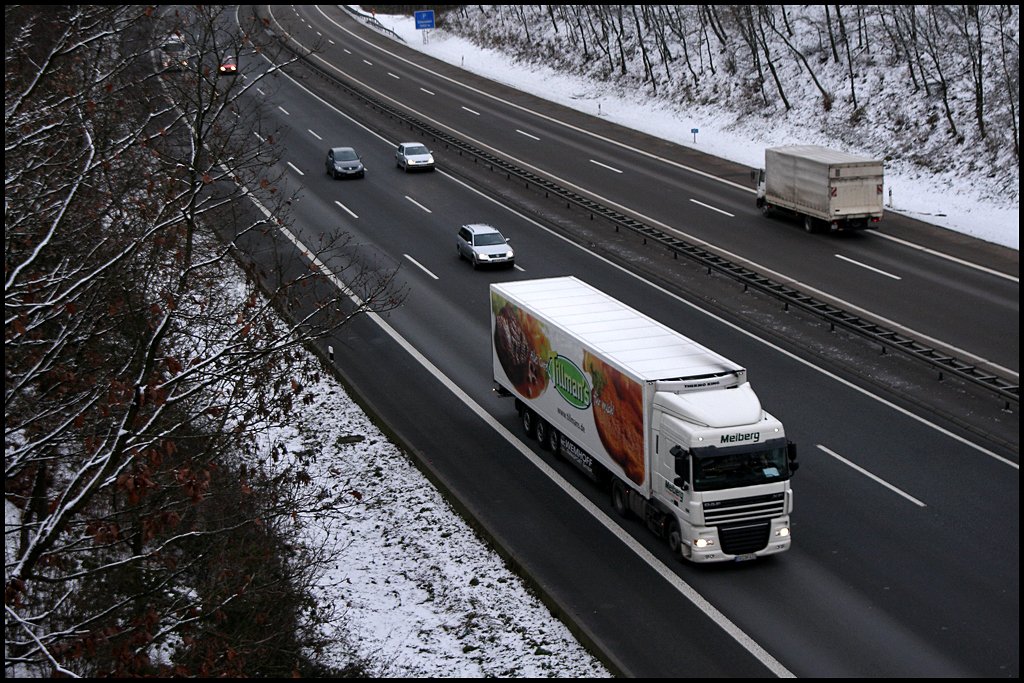 Die Homert hinauf fährt dieser DAF XF105.460SC "SpaceCab" von MEIBERG mit einem Kühlauflieger für TILLMAN´S. (11.12.2008)