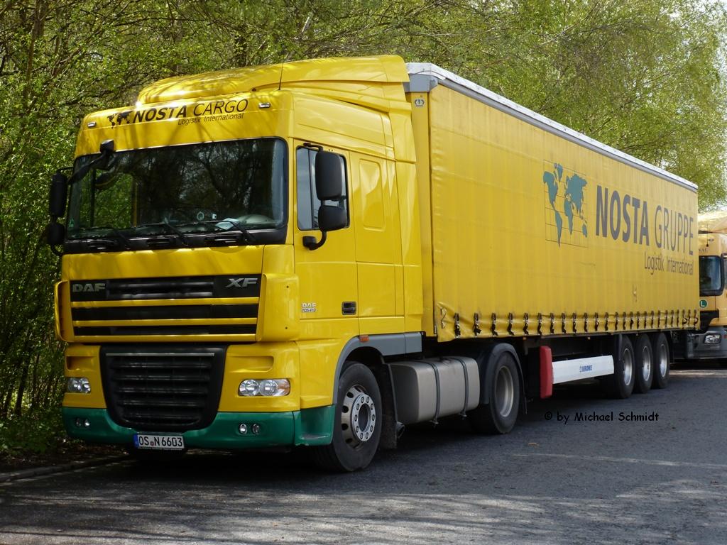 DAF 105.410 XF gelb grün mit Krone Sattelauflieger der NOSTA Gruppe geparkt in Herten am 22.04.2012