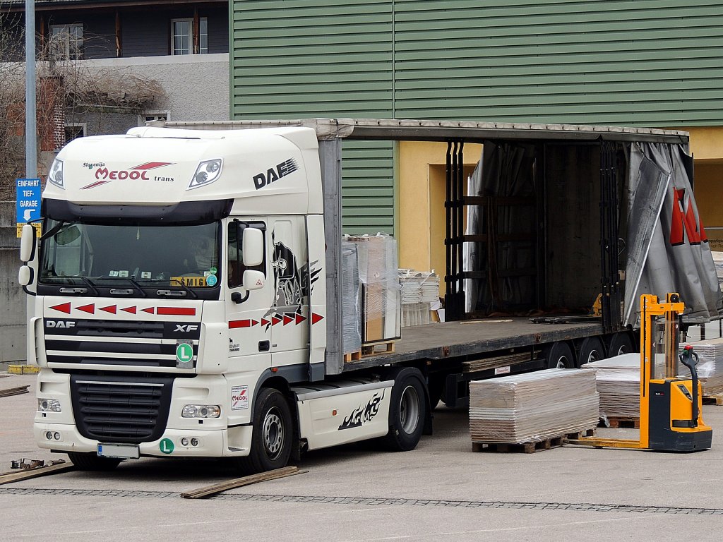 DAF XF105.480 von MEDOL-trans steht samt Auflieger zur Beladung von alten Einrichtungsgegenständen bei einem aufgelassen Kaufhaus bereit; 130404