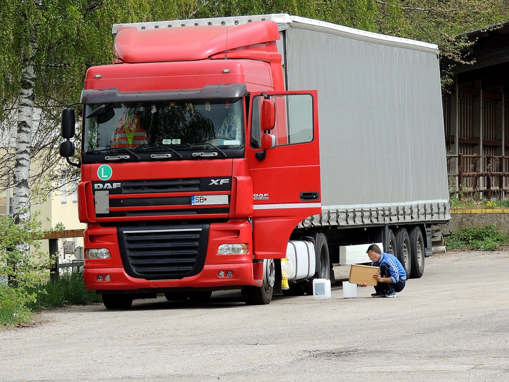 DAF XF105.460 gemeldet im Kreis Sibiu (Romania), und der dazugehörige Fahrer warten in Ried auf den Anruf vom Boss, um die nächste Ladestelle zu erfahren; 130427