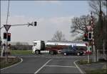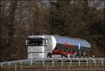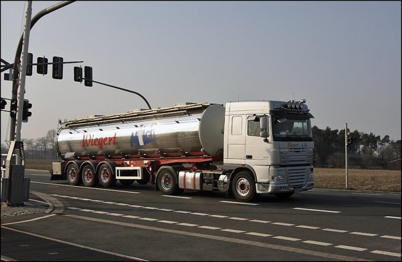 Diesmal konnte ich ihn viel besser ablichten: DAF XF105.460SC "SpaceCab" von WIEGERT MILCH ist in Richtung Beelen unterwegs. Als "Extras" wurden vercromtes Drucklufthorn, Lampenbügel, vercromte Felgen angebracht. Persönlich gefällt mir dieser DAF neben dem "Showtruck" am besten. (02.04.2009)