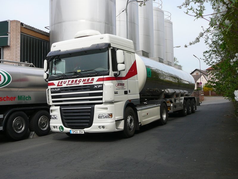 DAF XF 105.510 der Spedition Leutbecher nach der Entladung an der Molkerei Hünfeld, 16.04.09 in 36088 Hünfeld