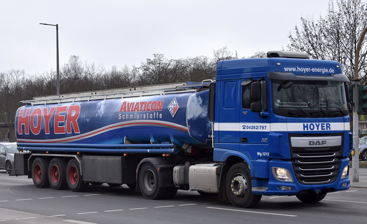 Wilhelm Hoyer GmbH & Co. KG. mit einem Tank-Sattelzug (AVIATICON Schmierstoffe) mit DAF 440 Zugmaschine am 02.03.23 Berlin Marzahn.