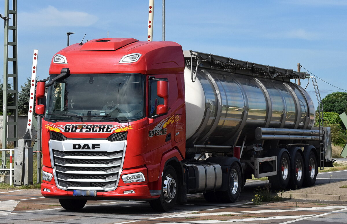 Gutsche Transporte GmbH mit einem Tank-Sattelzug mit DAF XF 480 Zugmaschine am 20.09.23 Höhe Bahnübergang Bahnhof Rodleben.