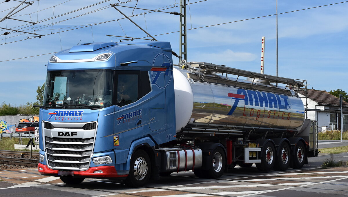 Anhalt Logistics GmbH & Co mit einem Tank-Sattelzug mit DAF XG 480 Zugmaschine am 20.09.23 Höhe Bahnübergang Bahnhof Rodleben.