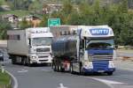 DAF XF Tanksattelzug von "Mutti" aus der Slowakei wird auf seinem Weg hinauf zum Brennerpass von einem MAN Sattelzug aus Tschechien verfolgt, 28.08.2012