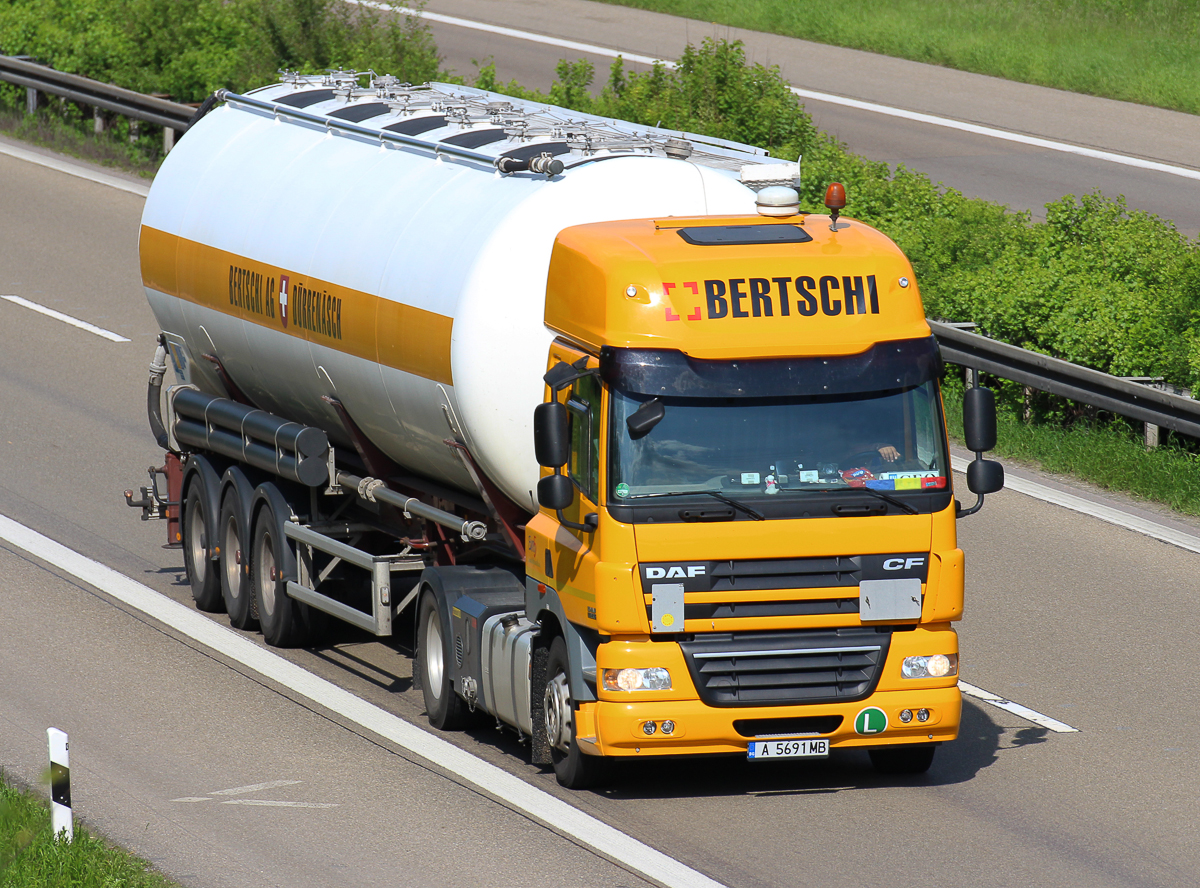 DAF CF 85.410 mit Siloauflieger von Bertschi aus Bulgarien unterwegs auf der BAB 6 bei Crailsheim, 05.06.2013