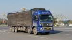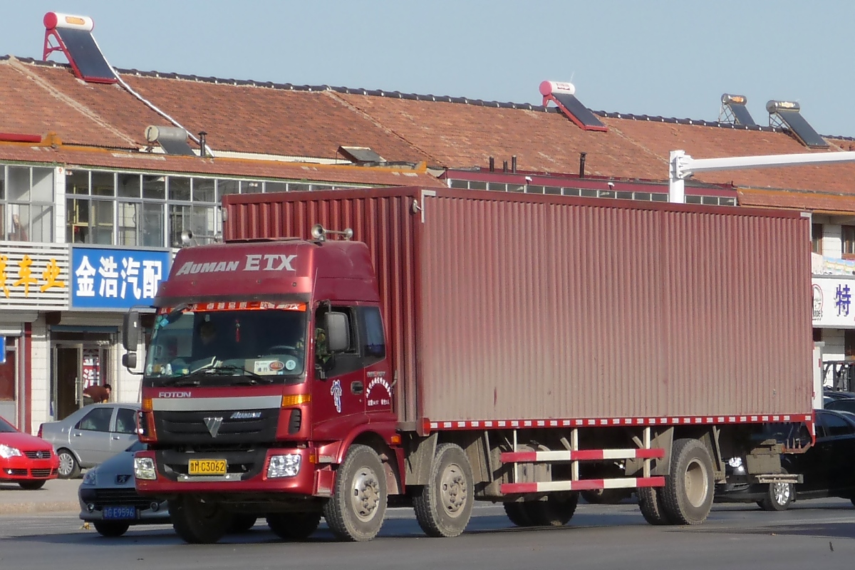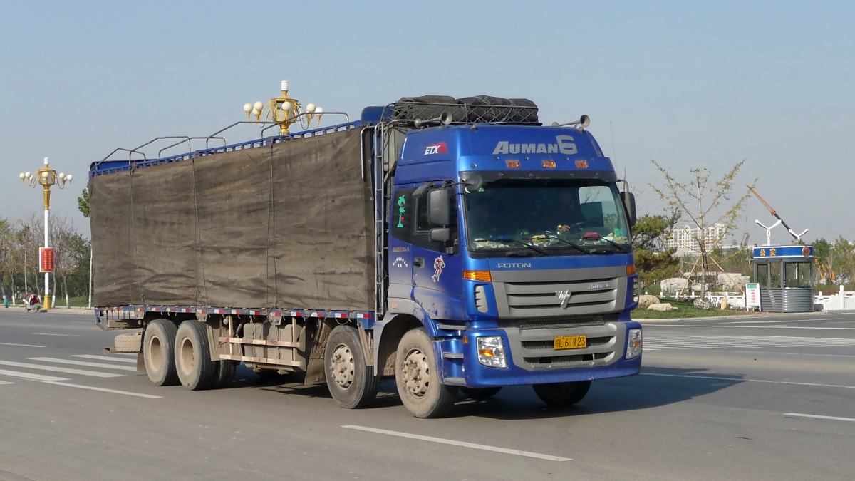 Dieser Foton Auman EXT kämpft sich mit offener Motorhaube durch das Qoltag-Gebirge bei Turfan, 11.8.2014