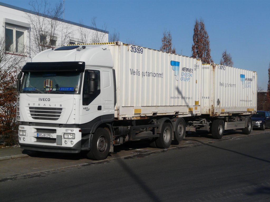 Iveco Stralis 420 Hängerzug mit Wechselbrücken von Hermes abgestellt im Nürnberger Hafengebiet, 02.02.2012