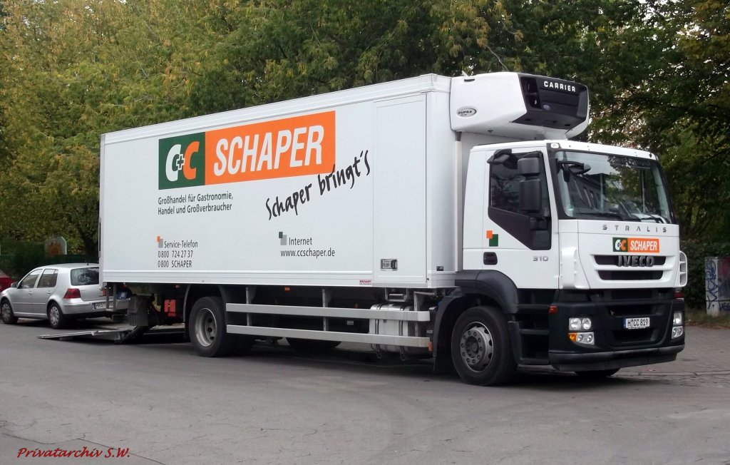 Iveco Stralis 310 mit Kühlkoffer für die Fa. C+C Schaper unterwegs, Rostock 28.9.2012