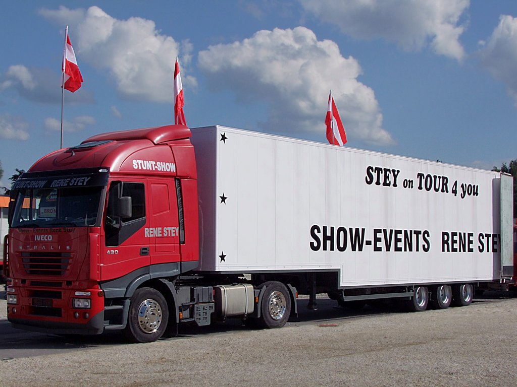 IVECO-STRALIS430 wurde anlässlich eines Auftrittes am Messeglände in Ried i.I. mit Österreich-Flaggen geschmückt;100731