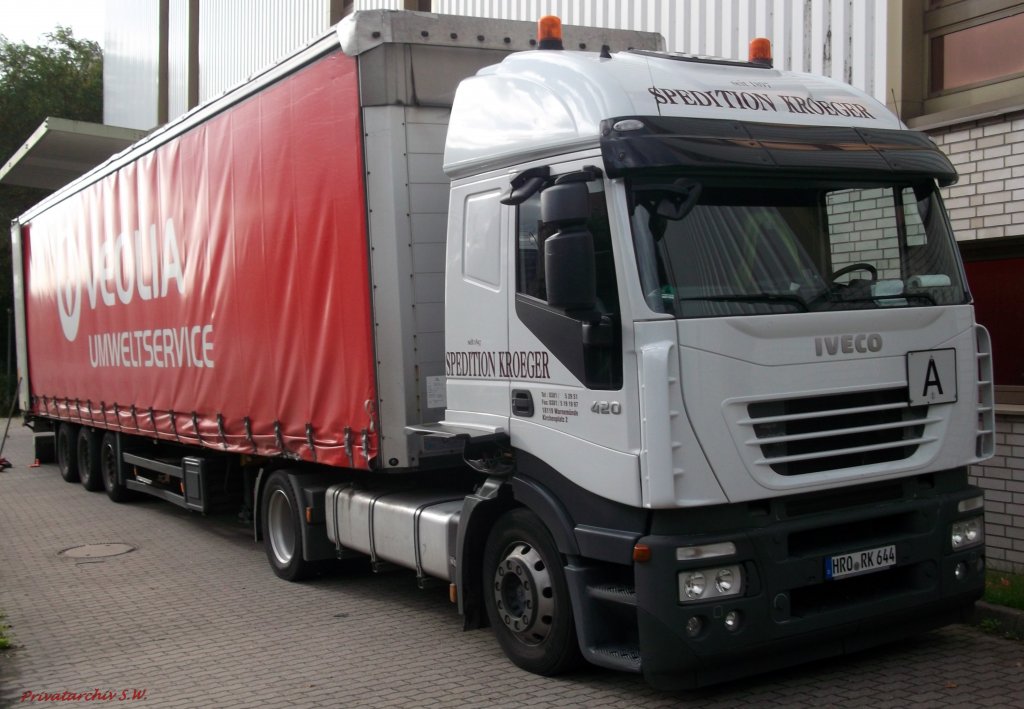 Iveco 420 der Spedition Kroeger und Auflieger von Veolia liefert Papierrolen für die Ostsee-Zeitung, Rostock 9.10.2012