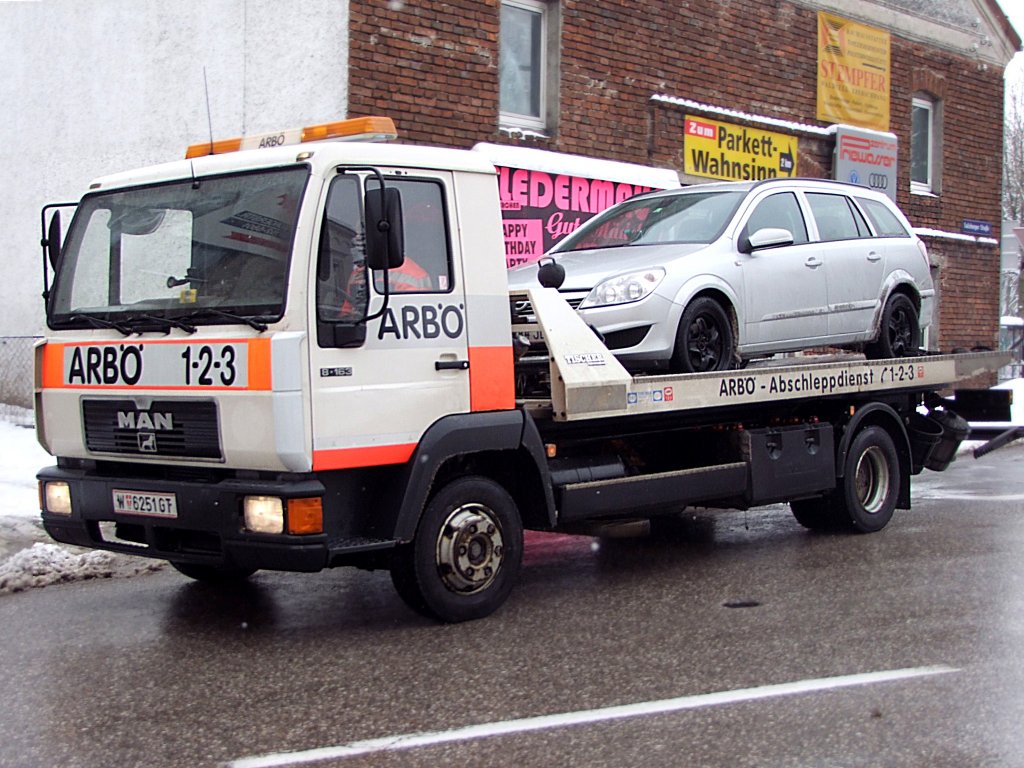 MAN 8.163 des ARBÖ erreicht mit seiner Ladung die Braunauer-Straße in Ried i.I.;100212