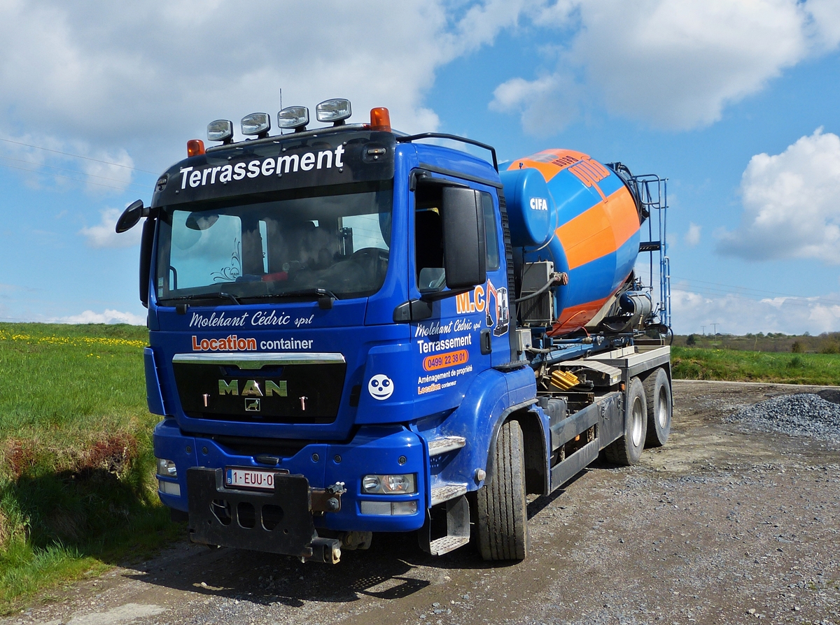. MAN Betonmischer wartet an einer Baustelle darauf seine Ladung abzuliefern. 28.04.2015
