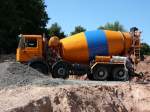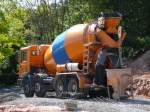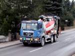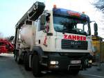 MAN TGA35.430 liefert Fertigbeton und beschickt einen Betonpumpenwagen bei der Krankenhausbaustelle in Ried i.I.; 090409