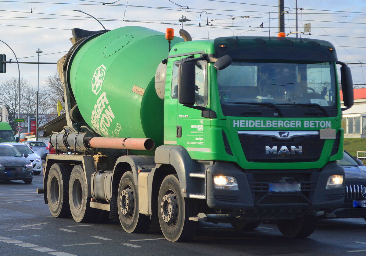 Heidelberger Beton GmbH (Berlin) mit einem MAN TGS 32.420 Betonmischer mit PUTZMEISTER Betontrommel am 23.11.22 Berlin Marzahn.