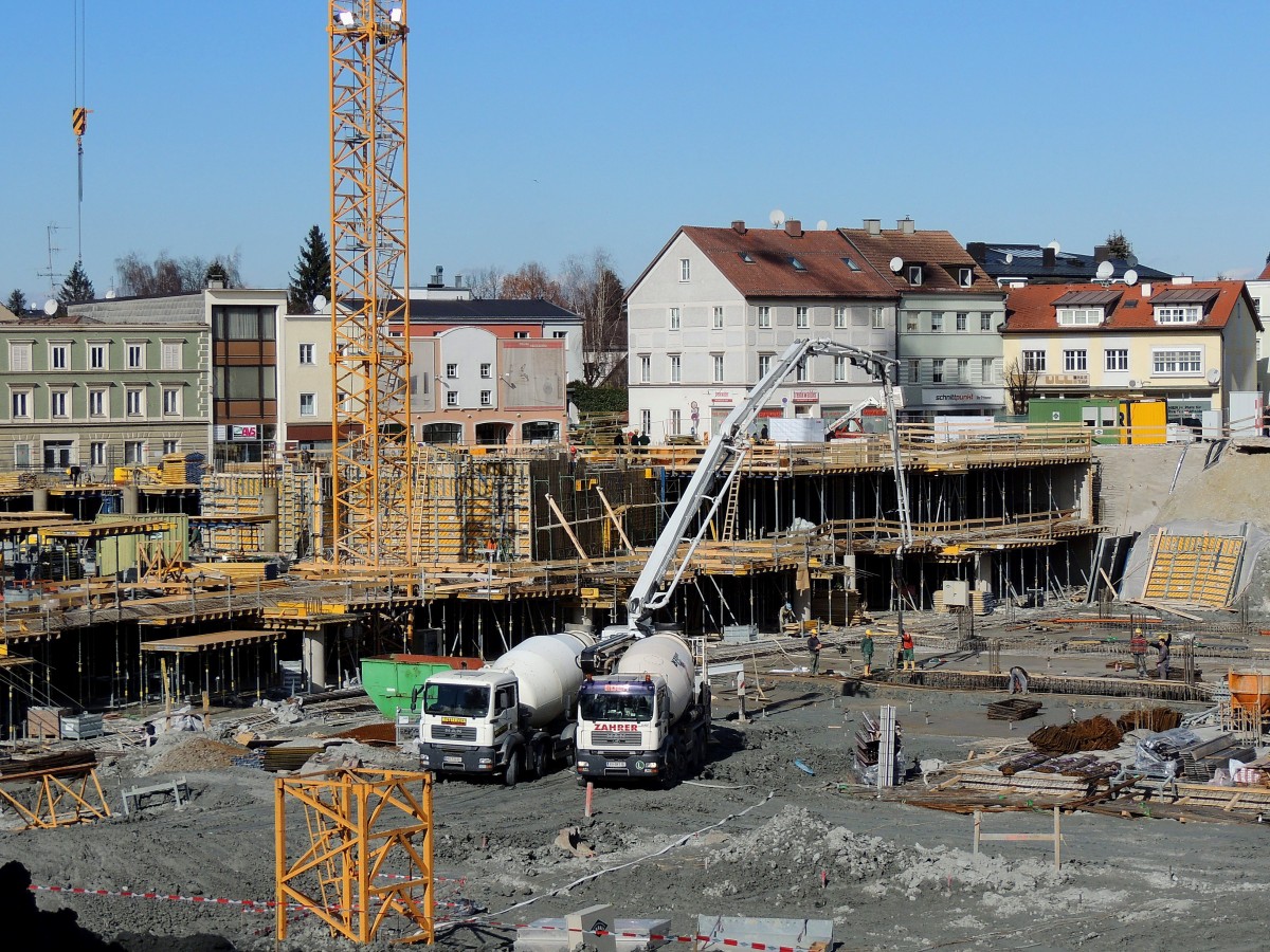 MAN-Betonmischerdoppel; TGA35.360 imf TGA35-430 D20-Commonrail; beschicken auf der EKZ-Baustelle "Weberzeile" in Ried gemeinsam den Pumpenwagen; 140228