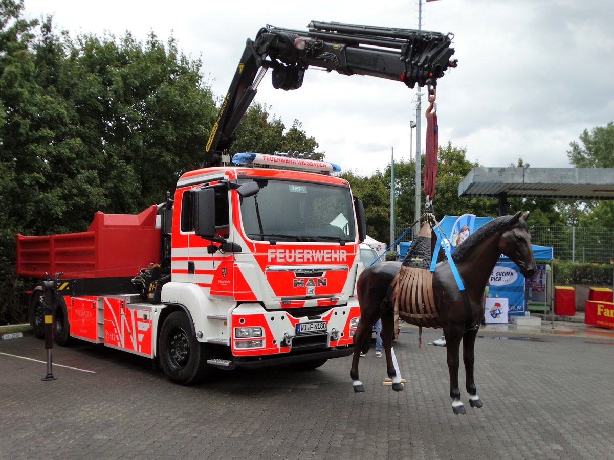 BF Wiesbaden MAN TGS WLF (Florian Wiesbaden 2/67-1) mit Pferd am Haken am 16.09.17 beim Tag der offene Tür an der Wache 2 in Mainz Kastel