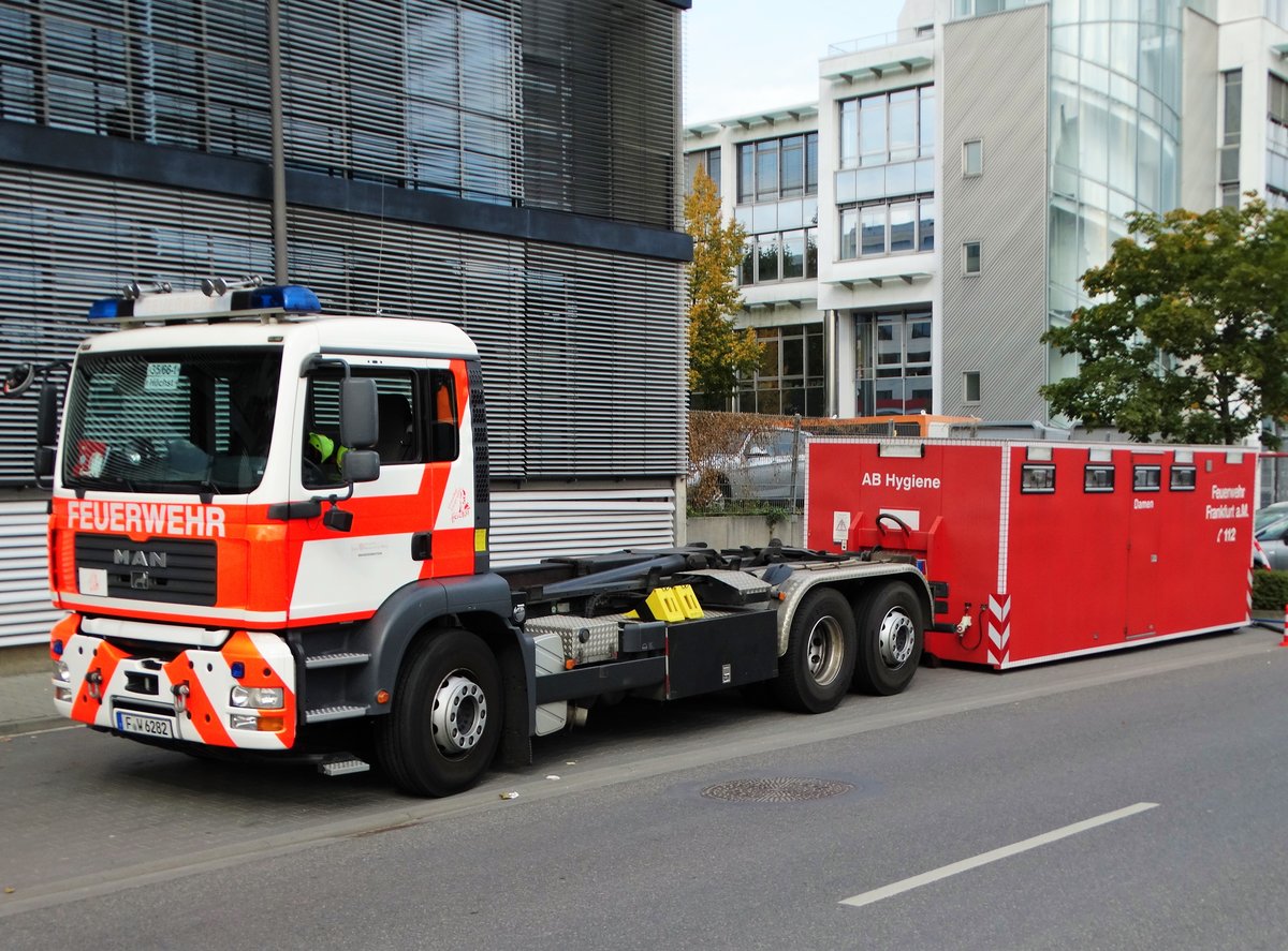 Feuerwehr Frankfurt Höchst MAN TGA WLF (Florian Frankfurt 35/66-1) mit dem Abrollbehälter Hygiene (Toiletten) am 30.09.17 bei der Katstrophenschutz Übung Frankopia im Osthafen