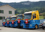 Am schweizerischen Nationalfeiertag beflaggte MAN-Lastwagenflotte am 1. August 2020 in Balsthal.