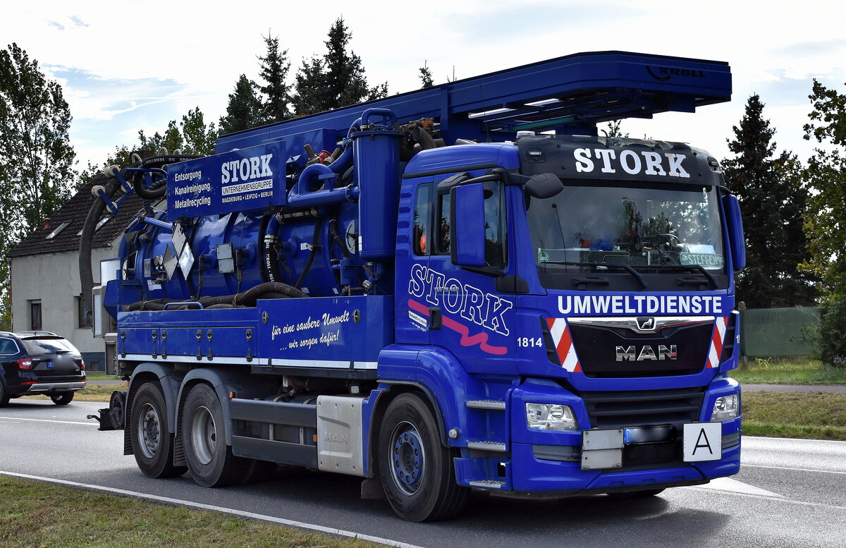 STORK Umweltdienste GmbH mit einem MAN TGS 28.460 Abwasserspülfahrzeug am 20.09.23 Höhe Bahnübergang Bahnhof Rodleben.