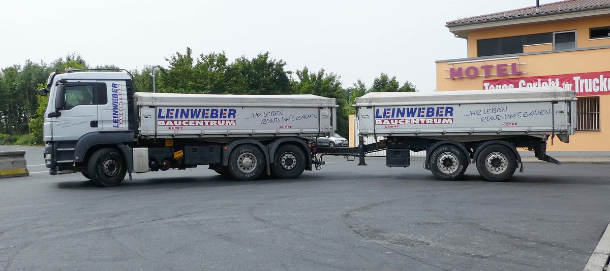 =MAN-Hängerzug vom Baucentrum LEINWEBER unterwegs auf dem Autohof Werneck im Juni 2018