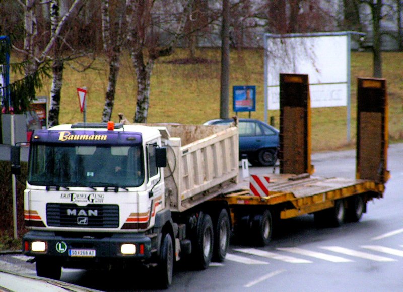 MAN mit Tiefladeranhänger fährt während Nieselwetter dem Ziel entgegen. Ried i.I. 080118