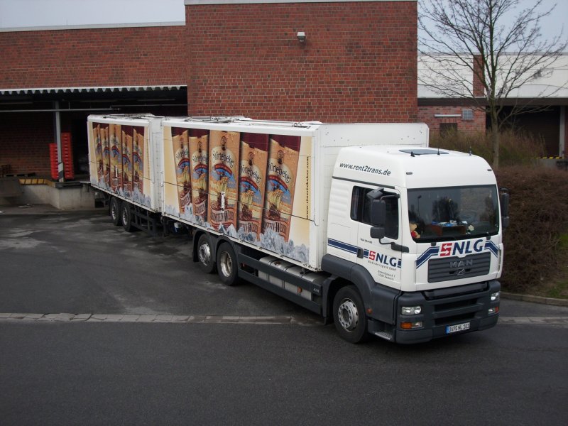 Ein MAN-GetränkeLKW an einem Supermarkt in Bergen/Rügen am 14.04.2008.