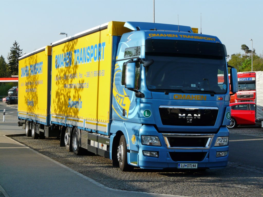 MAN TGX 26.480 Tandem-Hängerzug von "Omahen" aus Slowenien auf der Rastanlage Nürnberg/Feucht, 01.05.2012
