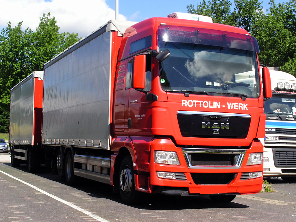 August 2012 / Von einem 3 -Achser MAN TGX 26.480 wird der 2 - Achshänger gezogen..unterwegs ist das Gespann für das Rottolin-Werk..