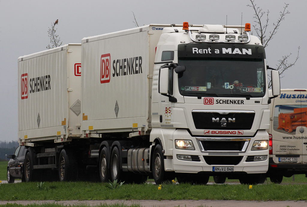 MAN TGX 26.480 Hängerzug mit Wechselbrücken von DB Schenker ist Richtung Autobahn unterwegs, Crailsheim, 19.04.2013