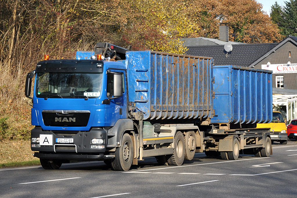 MAN Hängerzug, von Beton Weber, beladen mit Material für eine Baustelle. 12.2025