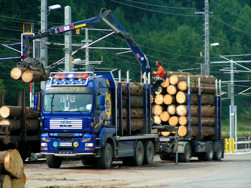 MAN (Woodrailer) bei der Rundholzverladung am Bhf. Frankenmarkt _070808