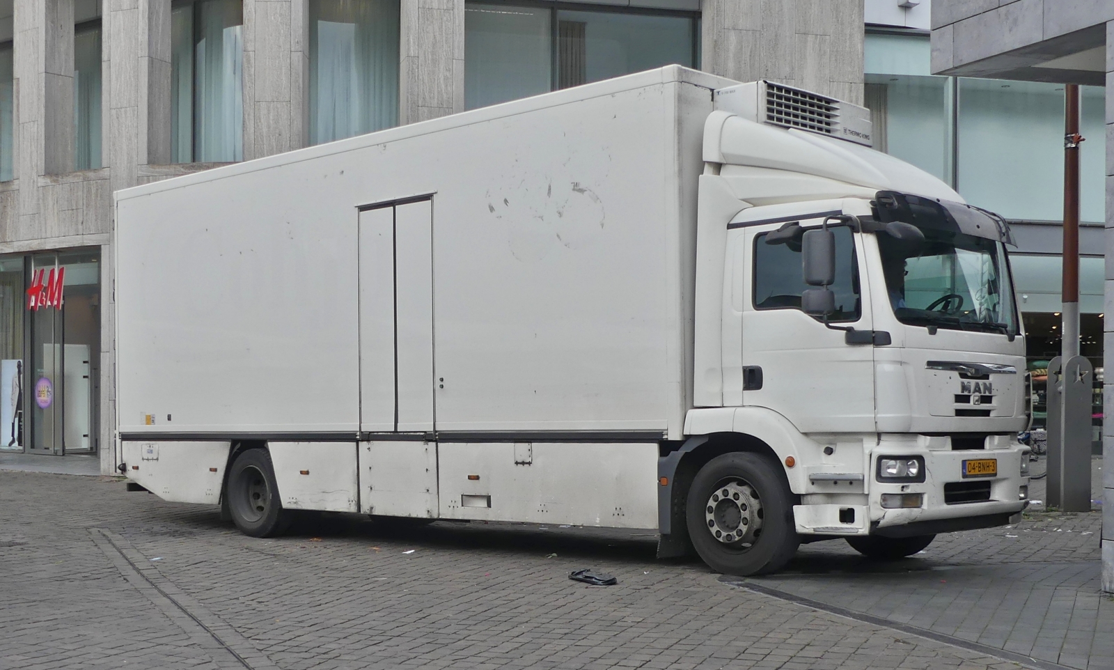 MAN Kastenwagen eines Blumenhändlers fährt zu seinem Stand am Markt in Maastricht. 04.2024