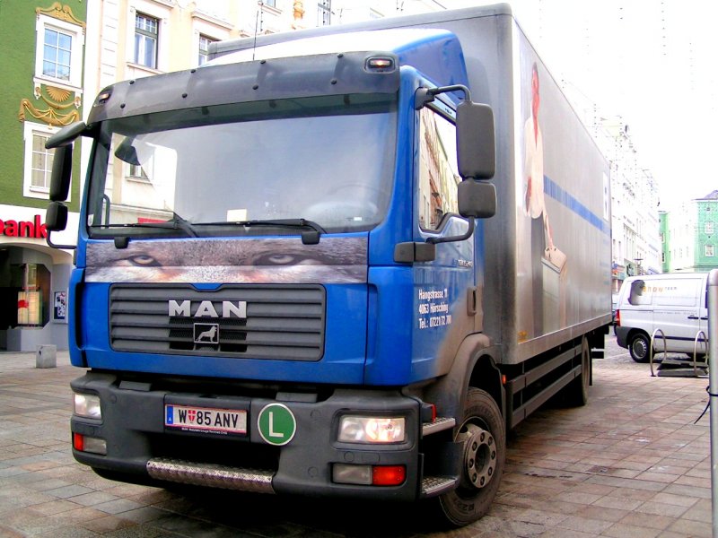 MAN(TGM15.240) einer Wiener Aktenvernichtungsfirma steht am Hauptplatz von Ried i.I.; 080102