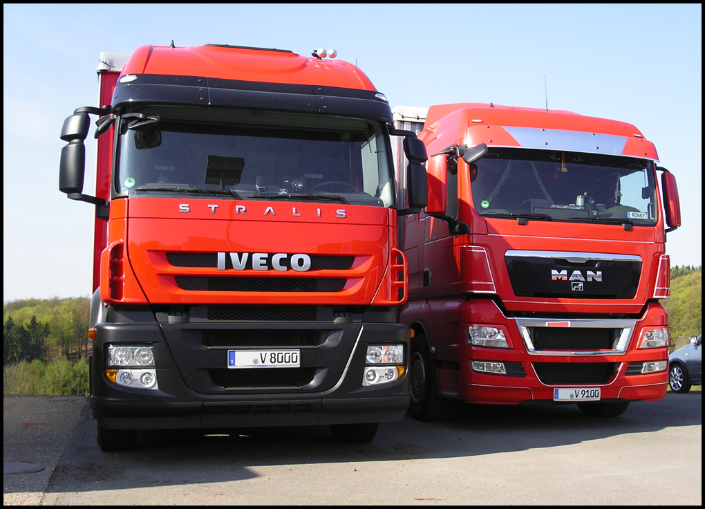 18.04.2011: zwei ungleiche Brüder blitzblank beim Gruppenfoto...Iveco-Stralis 420 und MAN TGX 26.440 gehören zum gleichen Unternehmen..