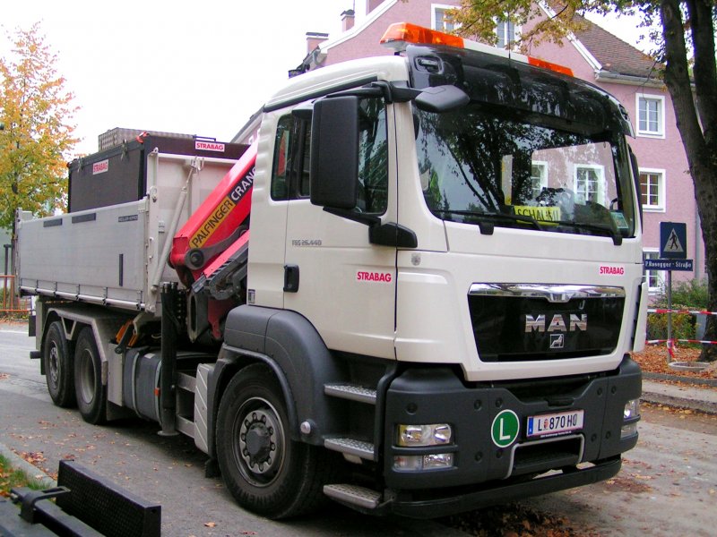 MAN(TGS26.440) mit zusätzlichem Palfingerkran wartet auf seinen Einsatz bei einer Straßenbaustelle in Ried i.I.; 081010