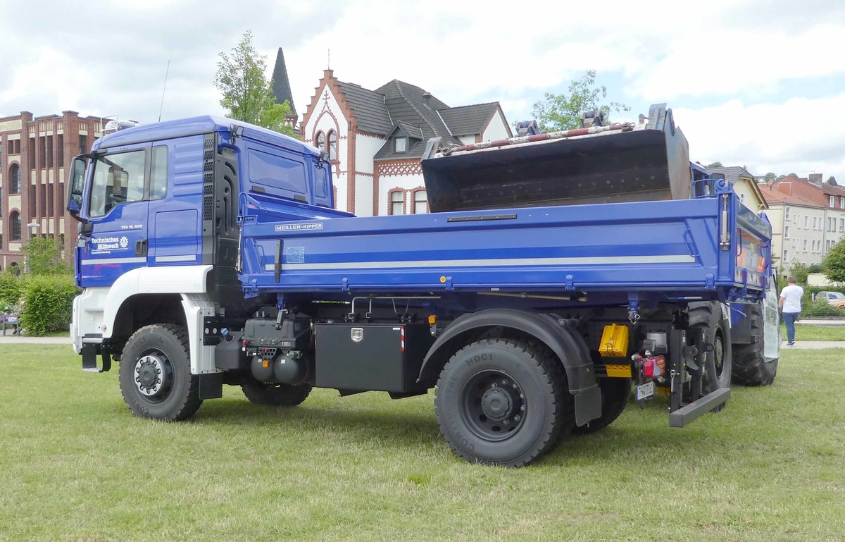=MAN TGS 18.420-LKW des THW stehen auf der Präsentationsfläche der Rettungs- und Hilfsdienste, gesehen im Juni 2019 beim Hessentag in Bad Hersfeld