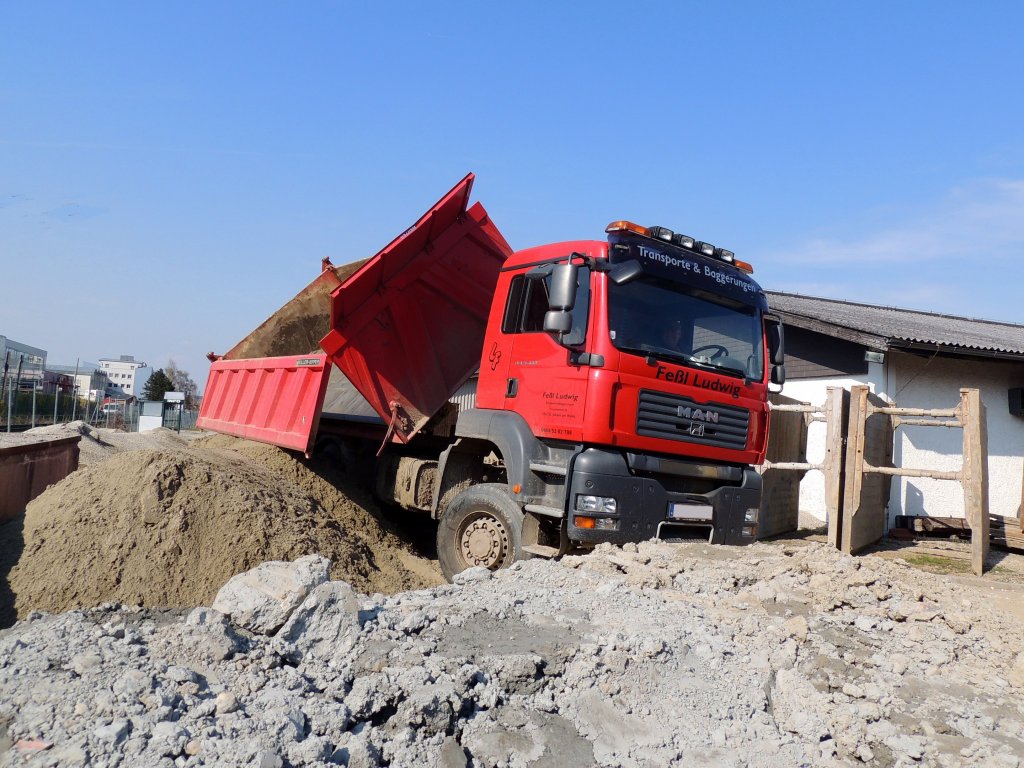 MAN TGA26.440 hat mit dem Meiller-Kipper eine Ladung Sand herangekarrt; 130418