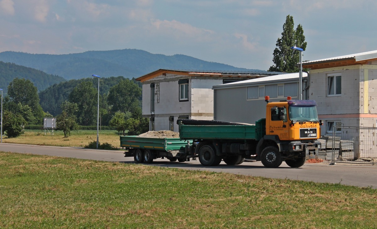 Am 08.07.2013 fuhr dieser MAN Kipplaster der Firma Schwald auf eine Baustelle in Sexau. Im Hintergrund ist der schöne Schwarzwald zu erkennen.