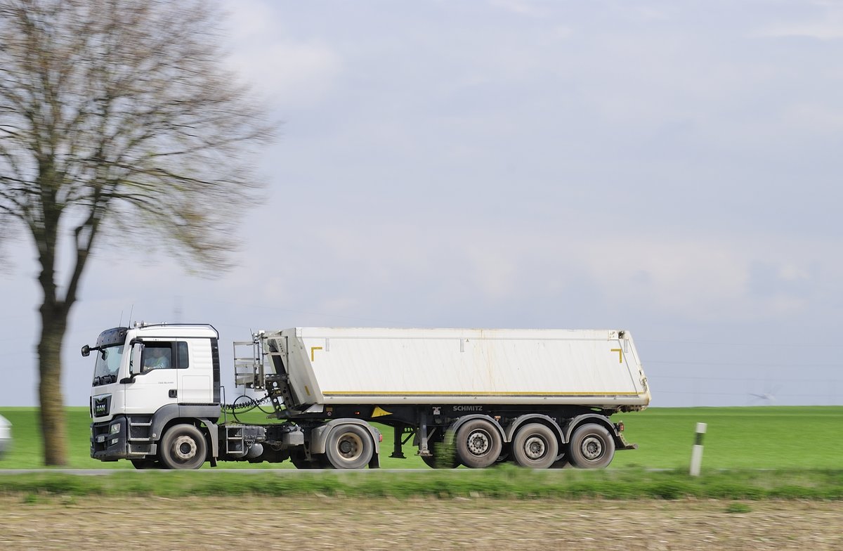 MAN TGS 18.440 Kippersattelzug, am 10.4.2017 auf der L 164 (ex B221) bei Übach - Palenberg