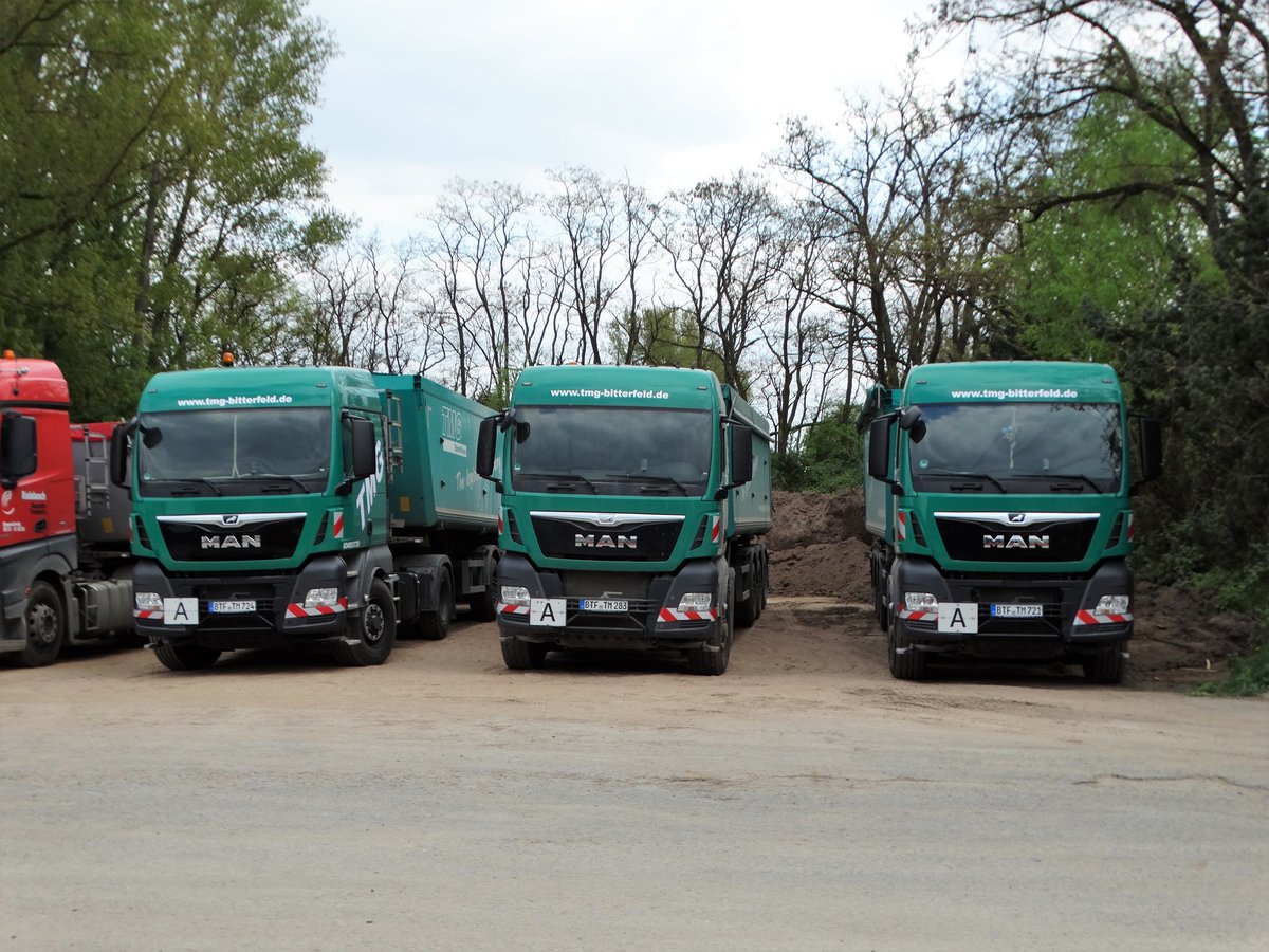 Drei TMG MAN TGS Kippersattelzugmaschinen am 14.04.17 in Hanau in einen Industriegebiet