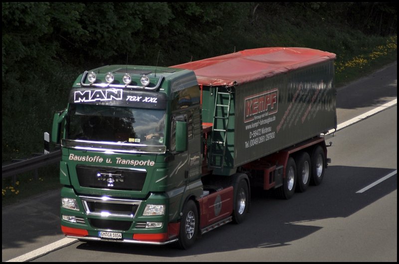 Das richtige Baufahrzeug :-P : MAN TGX 18.540XXL der D&B Transporte aus Marienheide ist mit einem KEMPF Kippsattel bei Lüdenscheid unterwegs. Die Zugmaschine ist ausgestattet mit Lampenbügel, Steinschlagschutz und beleuchteter Unterfahrschutz. (04.05.2009)