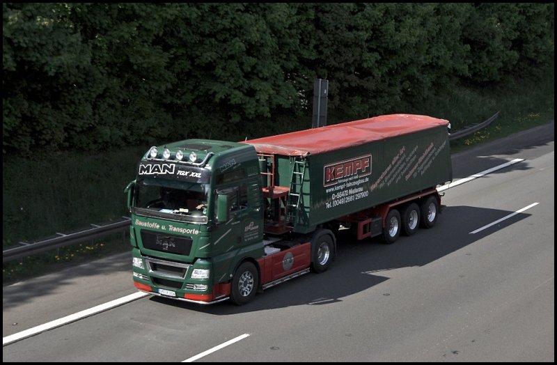 Das richtige Baufahrzeug :-P : MAN TGX 18.540XXL der D&B Transporte aus Marienheide ist mit einem KEMPF Kippsattel bei Lüdenscheid unterwegs. Die Zugmaschine ist ausgestattet mit Lampenbügel, Steinschlagschutz und beleuchteter Unterfahrschutz. (04.05.2009)