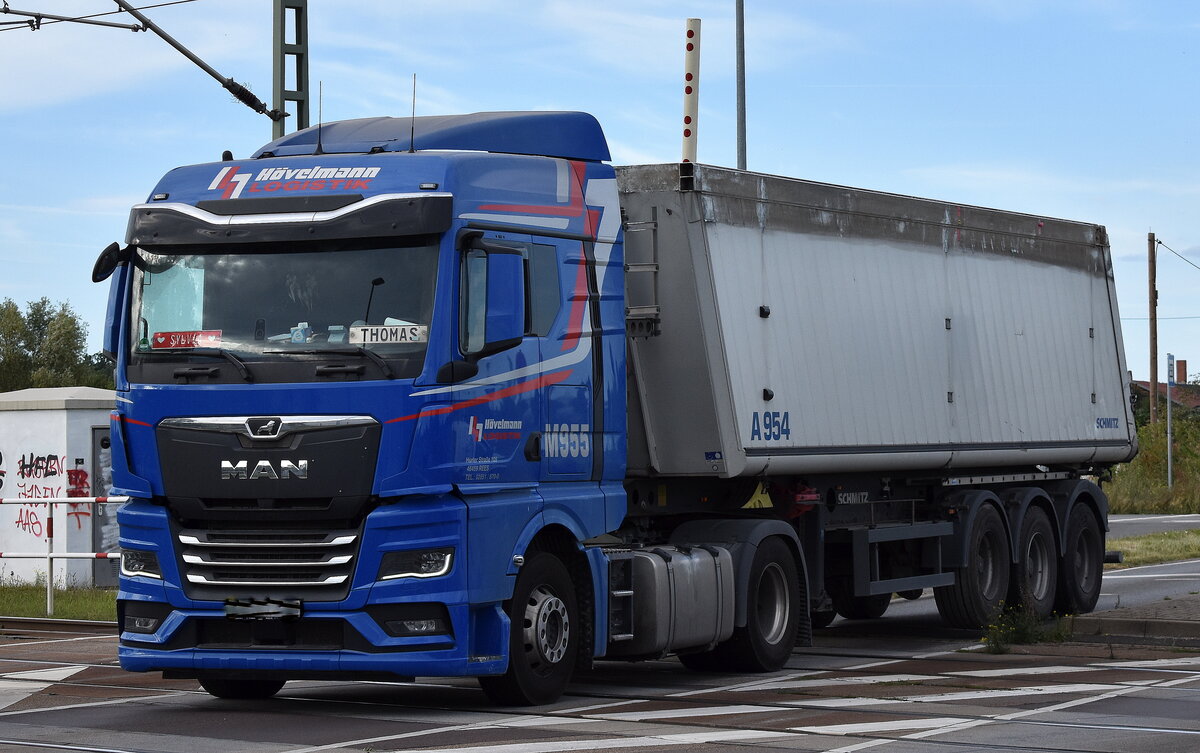 Hövelmann Logistik GmbH & Co. KG mit einem hochwandigen Sattelkipper mit MAN TGX Zugmaschine (regional ist gerade Zuckerrüben Ernte) am 20.09.23 Höhe Bahnübergang Bahnhof Rodleben.